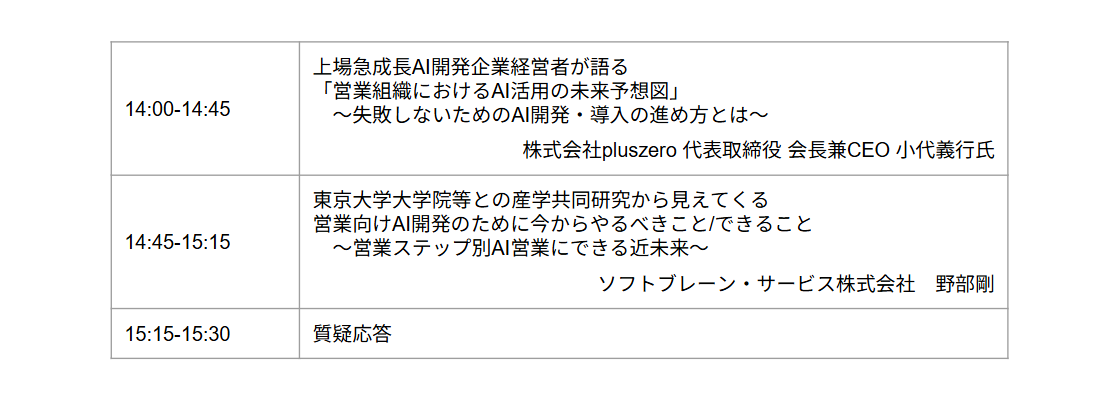 現在、AI開発領域で最も注目されている東証グロース上場の急成長企業であるpluszero(証券コード:5132)の代表取締役会長兼CEOである小代義行氏をお招きして、実際に産業適応されているAI活用の事例やデモンストレーションを通じて、「営業組織におけるAI活用の未来予想図」について語り尽くして頂きます。